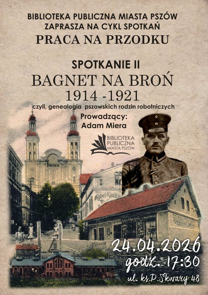 W piątek 24.04.2026 r. o godz. 17:30 zapraszam serdecznie do Biblioteki Publicznej Miasta Pszów przy ul. ks. P. Skwary 48 w Pszowie, gdzie będę miał przyjemność poprowadzić drugie spotkanie z cyklu „Praca na przodku”. Tym razem zmierzymy się z okresem 1914-1921, czyli czasem wielkiej wojny i powstań śląskich. Jakie informacje o naszych przodkach znajdziemy w archiwach i serwisach internetowych? Do jakich książek i opracowań sięgnąć, żeby lepiej poznać ten przełomowy czas w historii naszego regionu? Na te i inne pytanie odpowiemy sobie już niebawem. Do zobaczenia w Pszowie!