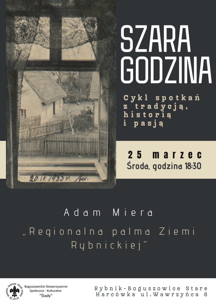 25.03.2026 r. o godz. 18:30 zapraszam do Harcówki BSSK „Ślady” przy ul. Wawrzyńca 6 w Boguszowicach Starych, gdzie w ramach cyklu „Szara godzina” będę miał przyjemność poprowadzić spotkanie dotyczące regionalnej palmy wielkanocnej ziemi rybnickiej. Będzie to też świetna okazja do rozmowy na temat tradycji i dawnych obyczajów naszych przodków. Zapraszam serdecznie!